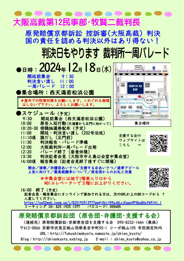 ~認めて!避難の権利 守ろう!子供の未来~ ![]() 2013年9月17日、放射線汚染による健康被害を恐れて福島などから京都に避難している33世帯91人が、国と東電に損害賠償を求めて京都地裁に提訴しました。その後、第2次提訴、第3次提訴を経て、57世帯173名が一審判決(2018年3月15日)を受けました。全員提訴後、1世帯2名が控訴を取り下げ、現在56世帯171名が控訴審を闘っています。 いよいよ12月18日、控訴審(大阪高裁)での判決が言い渡されます。判決行動にみなさんのご参加をお願いします。 いよいよ12月18日、控訴審(大阪高裁)での判決が言い渡されます。判決行動にみなさんのご参加をお願いします。 *チラシ(PDF・背景色あり)はこちら