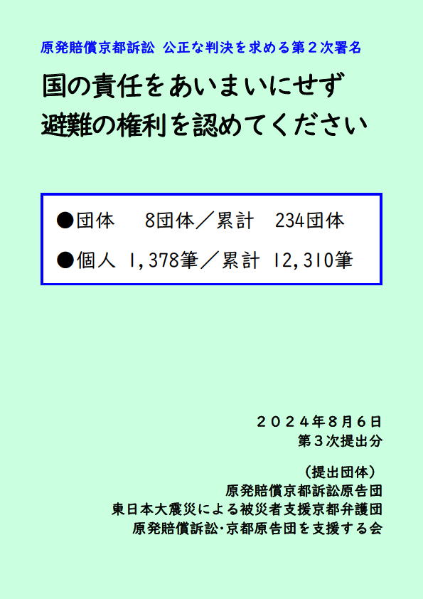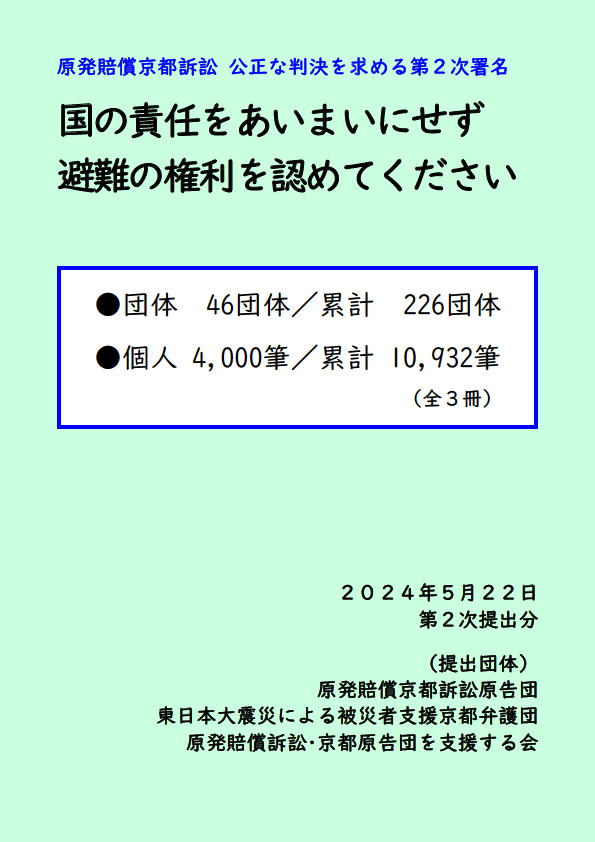●原発賠償京都訴訟団からのメッセージ動画はこちら ・ 「控訴審ラストスパート頑張ります」はこちら ・ 公正な判決を求める署名@バイバイ原発京都はこちら ●公正な判決を求める第2次署名(大阪高裁宛) 国の責任をあいまいにせず避難の権利を認めてください *大阪高裁宛ての署名を集めてください。よろしくお願いします。 ・ 個人署名はこちら ・個人署名(白黒)はこちら ・ 団体署名はこちら ・呼びかけチラシはこちら