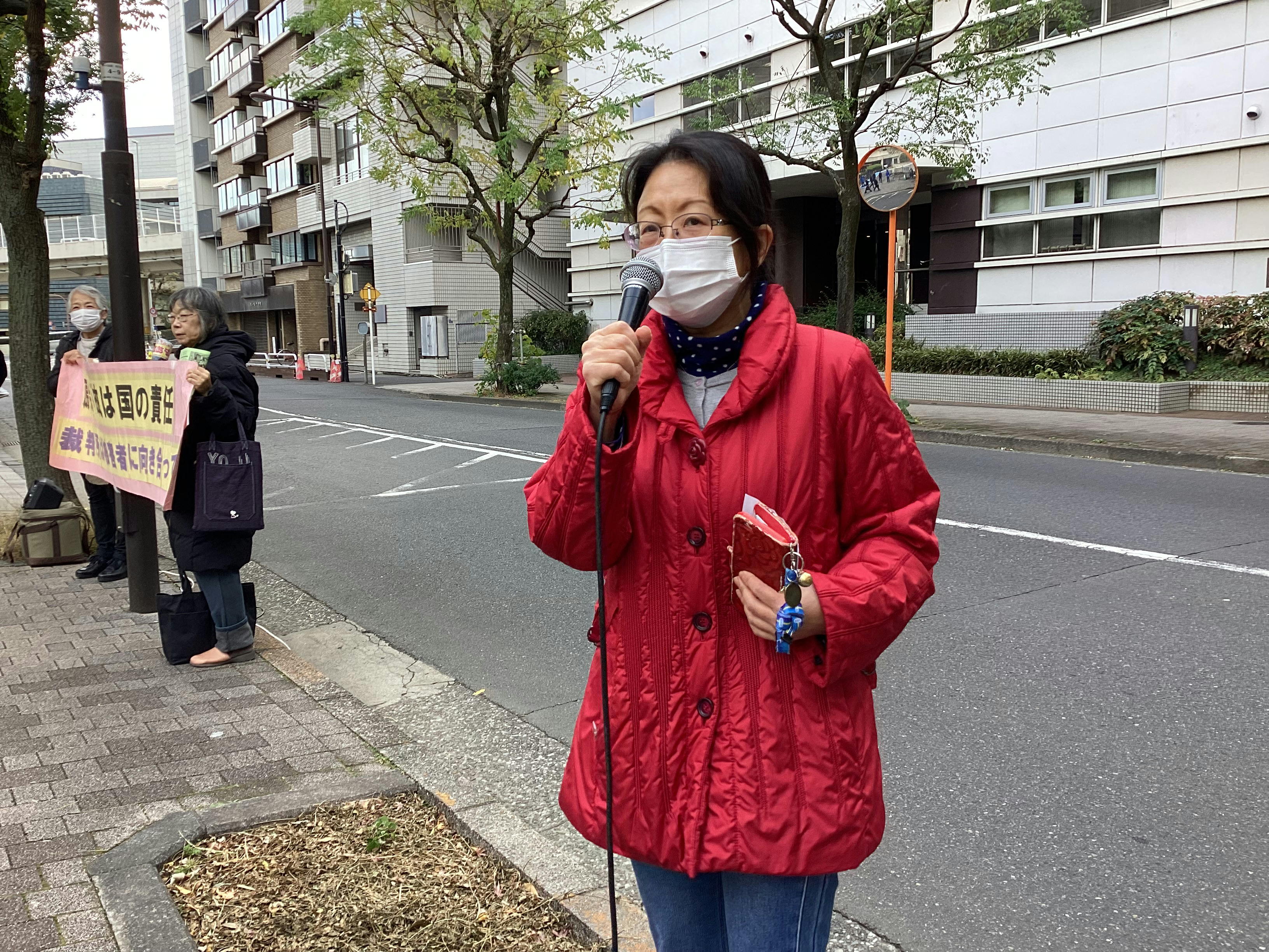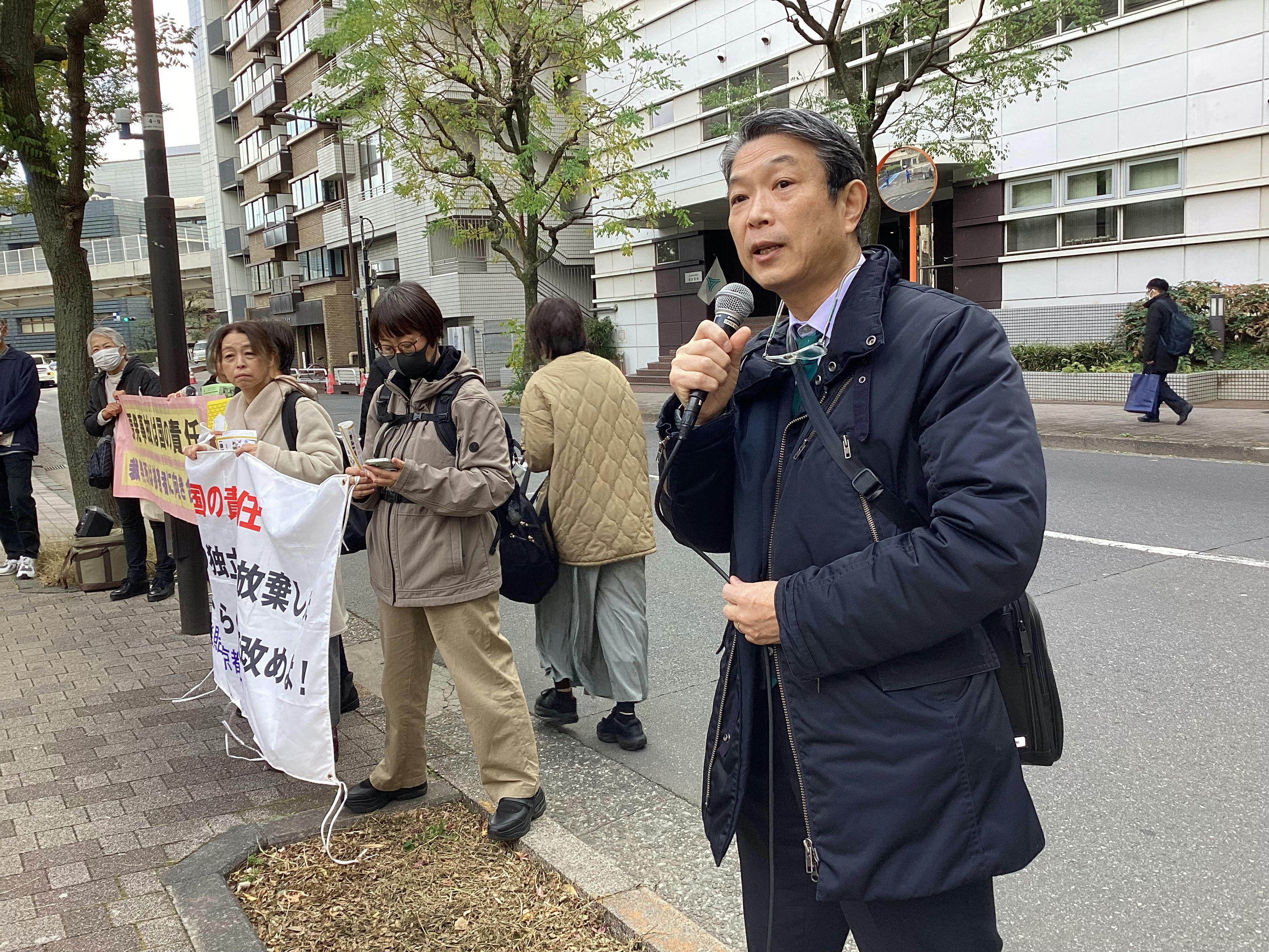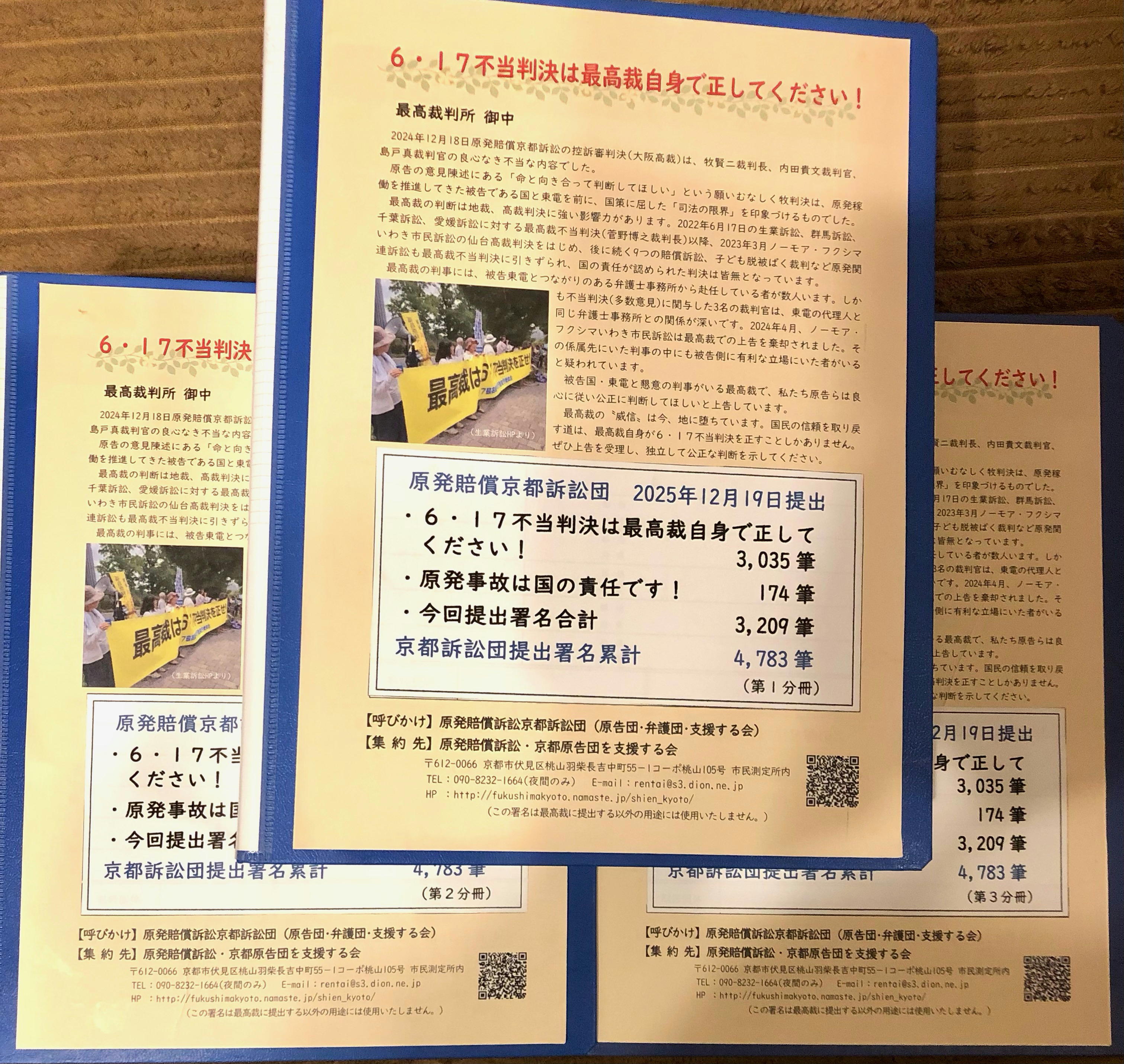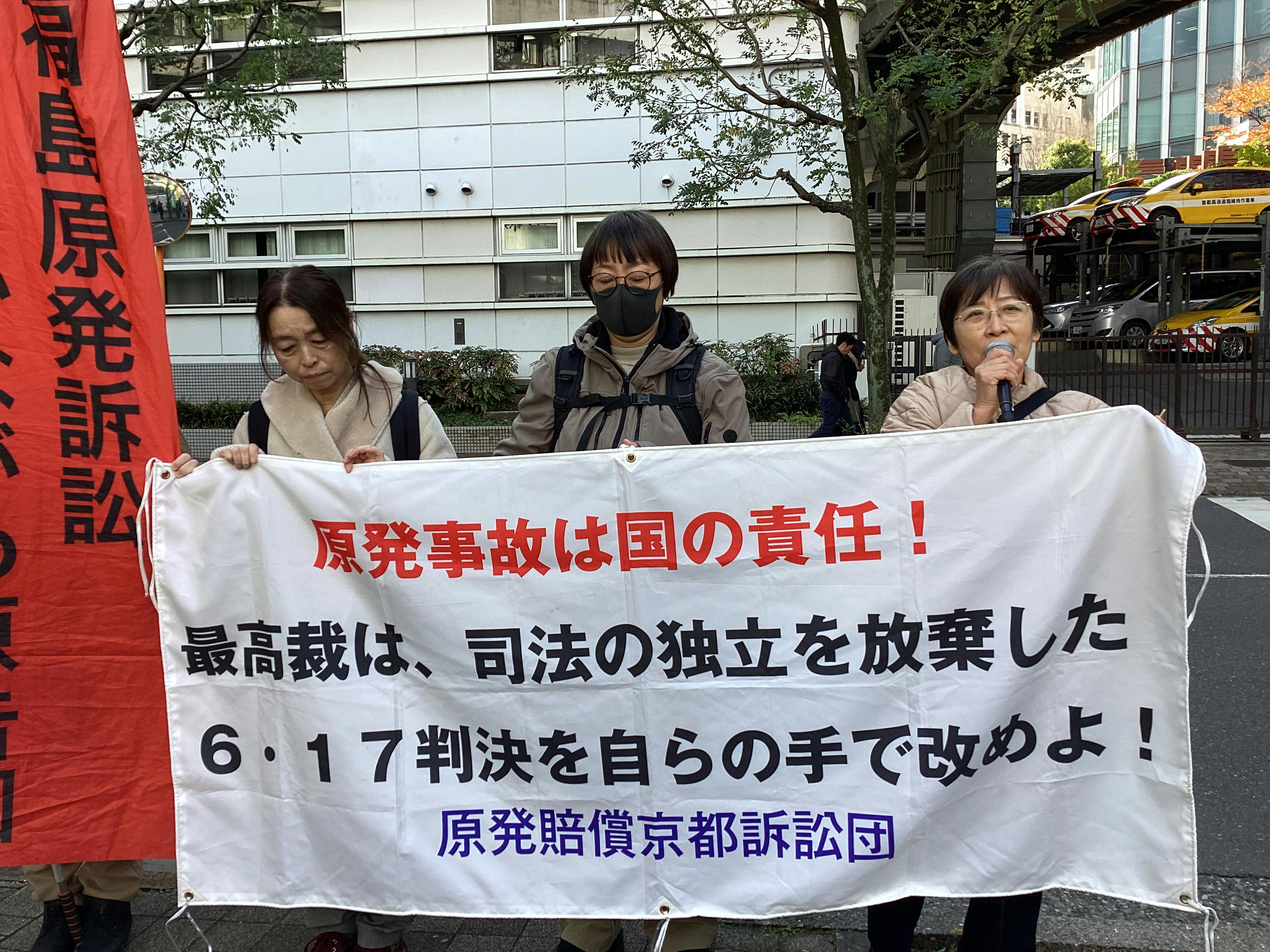 集合場所の最高裁西門前には、千葉訴訟、かながわ訴訟、だまっちゃおれん愛知岐阜訴訟、関西訴訟、避難者住宅追い出し訴訟、住まいの権利裁判、6・17最高裁共同行動実行委員会などこれまで繋がりがある団体のほか、最高裁に上告中(係属先は未定)の東電株主代表訴訟からの参加もあり、前回を上回る50名規模でのアピール集会を行なうことができました。2回の6・17最高裁共同行動を経て共闘の輪が広がっているのを感じました。 京都訴訟が係属することが決まった第1小法廷には、先日係属が決まったあぶくま会訴訟を含め9訴訟が係属しています。最初のだまっちゃおれん愛知岐阜訴訟が上告してからすでに1年半が経過しており、そろそろ判断が示される可能性が高まっています。都内の労働組合から送られてきた最高裁宛て署名約7千筆がまだ未提出だったので、京都の署名と合わせて全国連として約1万筆の署名を最高裁に提出しました。 アピール集会では、原告が全員前に並び、一人ひとりが要請行動に参加した思いを語りました。応援に駆けつけてくれた方からもアピールを頂きましたが、いま関係者が注目しているのが避難者住宅追い出し裁判です。原告2人のうち1人について最高裁第2小法廷が上告を受理し来年1月9日に判決を言い渡すと通知してきたのです。上告を受理するということは避難者側に有利な判断が示されるのではないかと期待されています。 昼食休憩をはさみ、14時から最高裁の面談室に入り、田辺弁護士が現地には不参加の原告のものを含む要請文集を担当の町島・主席書記官補佐に手渡したあと、原告11名全員がそれぞれの要請文を読み上げる形で要請を行ないました。最後に、京都訴訟団が集めた3,209筆を含む全国連の署名10,545筆を提出して要請行動を終えました。 最高裁が判断を示す時期は迫っていると思われます。京都訴訟団は今後も他の訴訟団や全国連としての要請行動にも積極的に参加していきますので、最後までご支援をよろしくお願い致します。 ●京都訴訟団による第2回最高裁要請行動のスケジュール ・11:30 西門前に集合・12:00 最高裁前アピール行動開始 ① 「風になりたい」替歌 ② 弁護団から(田辺弁護士) ③ 参加原告から ④ 各訴訟・支援団体から ⑤ 支援する会スタッフから ⑥ 「風になりたい」替歌 ・13:00アピール行動終了 昼食休憩 ・13:50 集合 ・14:00 最高裁要請行動・署名提出(30分) 要請者 弁護団2名・京都原告11名・会スタッフ・各地支援 (合計17名) ・14:30 終了