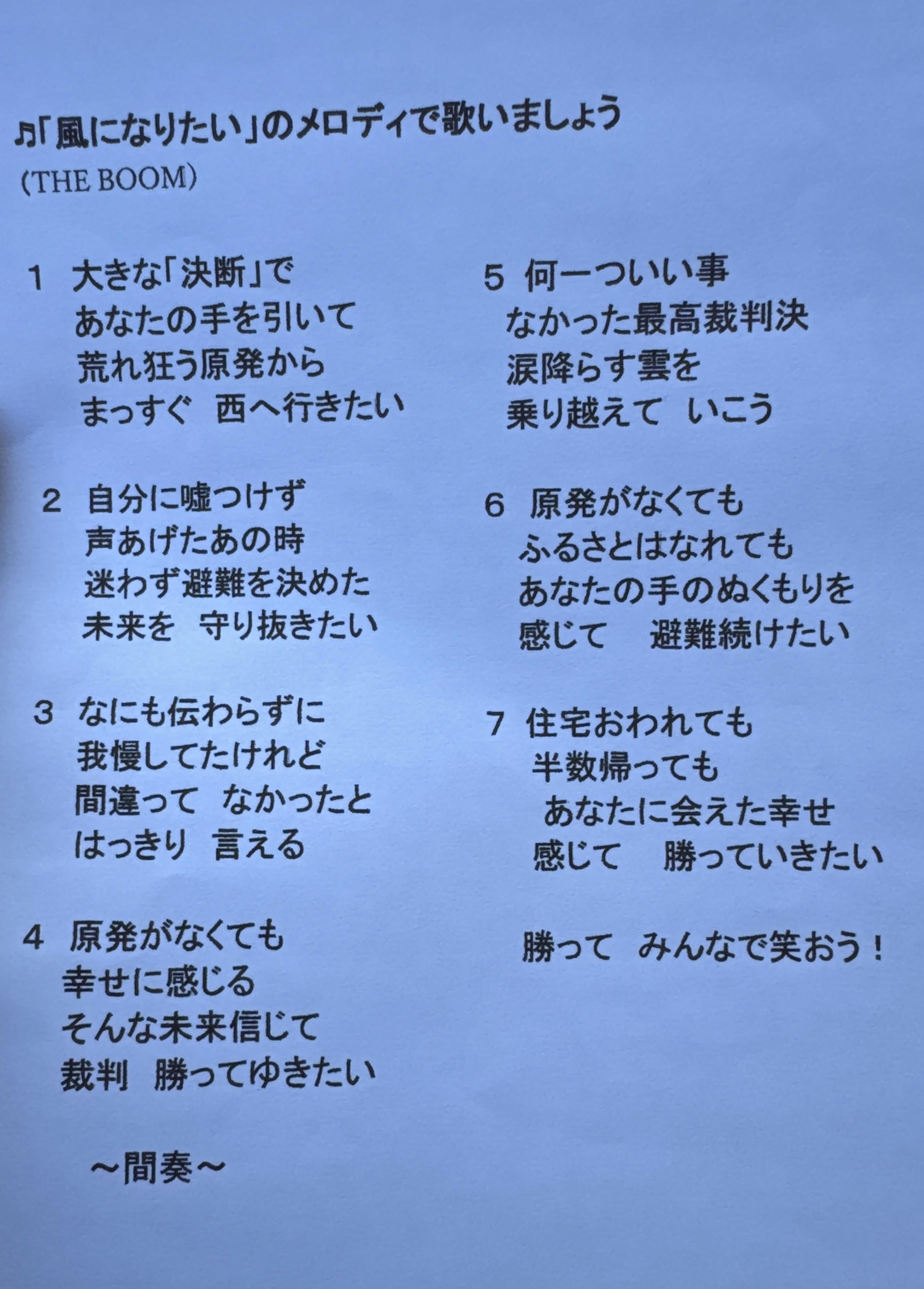 ●原告番号10-2 2011年3月_東日本大震災にて東京電力の福島第一原子力発電所で原子力事故が発生しました。私達は福島県福島市に住んでいましたが、政府からは「直ちに健康に影響を与えるレベルではない」を繰り返すだけで避難指示はなく、妻と子供は被爆という見えない、そして未知の恐怖から自分達を守るために、自主的に避難しました。その後、事故原因や事故範囲が徐々に明らかになるにつれ、自主避難への賠償、事故責任は不明瞭となり、私達は京都で集団訴訟を行いました。地方裁判を経て、高等裁判所の判決で、賠償は受け入れたたものの、国に事故責任は無いとする判決には到底納得できません。 その理由として、福島の原子力事故は国際原子力事象評価尺度において、7段階レベルで最高となる『レベル7』とされています。『レベル7』に分類されている事故は、1986年4月に発生したチェルノブイリ原子力事故と福島の原子力事故の2つのみとなっており、チェルノブイリ原子力事故後に行われた東京サミットにおいて『チェルノブイリ原子力事故の諸影響に関する声明文(仮訳) 1986年5月5日』で、「原子力発電を行っているいずれの国も、自国の原子力施設の設計、製造、運転及び維持管理の安全性について全責任を負っている。」と出されています。つまり、『国家として責任を持つ』を意味しており、日本も同意しての声明であることから、『レベル7』の事故に国の責任がないという判断は間違っていると感じます。 改めて最高裁判所で、国の事故責任について判断してもらいたく要請します。 ●原告番号16-1 2011年3月11日地震が起きなかったら、原発事故が起きなかったらどんなに良かったか、と思わない日はありません。あれから14年も経ってしまい記憶は年々薄れていってしまいますが、悔しい気持ちやむなしい気持ちは忘れることはありません。 原発事故が起きたとき娘はまだ3歳でした。情報が飛び交う中いろいろな不安がありましたが、一番の不安は小さな娘にとって放射能による健康被害があるのか、と言うことでした。全く分からないことだらけのなか、安全と思いたい自分と、ここにいては娘に将来健康被害が出てしまうかもしれないと思う自分がいました。結果的に自主避難を選択しましたが、これが一番良い方法だったのかは、いまだにわかりません。しかし福島に残る選択をした場合、子どもに相当な制限をさせる生活になったと思います。避難指示が出た地域の方々のご苦労は耐え難いものだとは思いますが、自主避難を選択した私たちも失ったものの大きさは計り知れないと思います。 事故から14年足らずで、原子力発電が次々と稼働しています。結局は、安全より経済活動のほうが優先されるのだと思うと、怒りを通り越してあきれ果てます。絶対に安全だといわれていたものが、事故を起こし制御不能になり、いまだに人間が近づくこともできない、それはまともなエネルギーなのでしょうか。放射能は匂いもしませんし見えません。しかし健康被害があると言われています。私も本当のところは、分かっていない部分も多いにあると思います。それでも私は、あのときの事故による放射能被害を恐れています。自分はともかく、小さかった娘に被害が出ないよう毎年、甲状腺の検査を自主的に受け続けております。もし何かあったらどうしようと思うと、やっぱり涙が出てきてしまうのです。 絶対に安全なんてないのです。事故はいつか起きるのです。どんなに安全対策をしても、結局経済を優先させた結果が福島第一原発事故だと思います。 ●原告番号18 原発事故があり、京都の木津川市へ避難してすぐ赤十字社から支援物資が届きました。それらは、原発関連企業のTOSHIBA製でした。 原発事故後、被告国は、法律を改悪し既存のルールを無視し、放射性物質の海洋投棄をしています。「移動しない」「拡散させない」「封じ込める」放射線防護の原則を被告らはいとも簡単に放棄し、賠償も責任も取らずに原発再稼働までもくろんでいます。 2022年6月17日の最高裁不当判決。その担当だった裁判官は、被告らのお友達でした。 母子避難させた原告のお父さんたちは、避難元に残りすくすくと育った子どもたちとのかけがえのない時間は戻ってきません。 障害を持つ家族の避難は、口にしがたい大変さがあります。甲状腺がんを患った原告がいます。病気で亡くなった原告が数名います。 事故当時は、原発の爆発と健康被害を思い、繁盛していた店をたたみ避難するしかありませんでした。ペットも愛する家族も離れ離れになりました。子どもは、友達にさようならも言わずに避難しました。 避難後は、就職、離職を繰り返しました。子ども原告は、遠く離れたお父さんに会えずに精神を患いました。 登校拒否を余儀なくされ、付きっ切りで面倒を見るために母親は仕事を辞め、生活保護を受けざるを得なくなった原告がいます。被告らはまだ区域内の人の住宅支援をしているが、